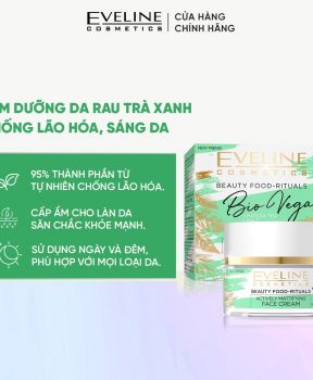 MÔ TẢ SẢN PHẨM :- Kem dưỡng da Eveline Bio Vegan Actively Matifying Face Cream giúp giảm quá trình lão hóa da do các gốc tự do, ô nhiễm và khói bụi. Phục hồi cân bằng da, điều tiết giảm sản xuất bã nhờn, kiềm dầu. Hồi sinh và làm căng bóng da, dưỡng ẩm, làm trắng và mềm mịn da.LOẠI DA PHÙ HỢP : - Phù hợp với da thường và da hỗn hợp.CÔNG DỤNG : - Kem dưỡng da trà xanh với 95% chiết xuất từ các siêu thực vật làm giảm quá trình lão hóa mạnh mẽ.- Phục hồi sự cân bằng của da, điều tiết sự tiết bã nhờn, giảm thiểu các khuyết điểm, se khít lỗ chân lông.- Ngăn ngừa bóng dầu và phục hồi sức sống.- Đảm bảo hiệu quả cấp ẩm làm mịn và nâng tông da.HƯỚNG DẪN SỬ DỤNG : - Chỉ cần dùng ngày 2 lần sáng - tối.- Thoa một lớp kem mỏng lên mặt và cổ sau khi da đã được vệ sinh sạch, massage 5-10 phút cho kem thấm sâu.BẢO QUẢN :- Tránh ánh nắng trực tiếp.- Để nơi khô ráo, thoáng mát.- Đậy nắp kín sau khi sử dụng.